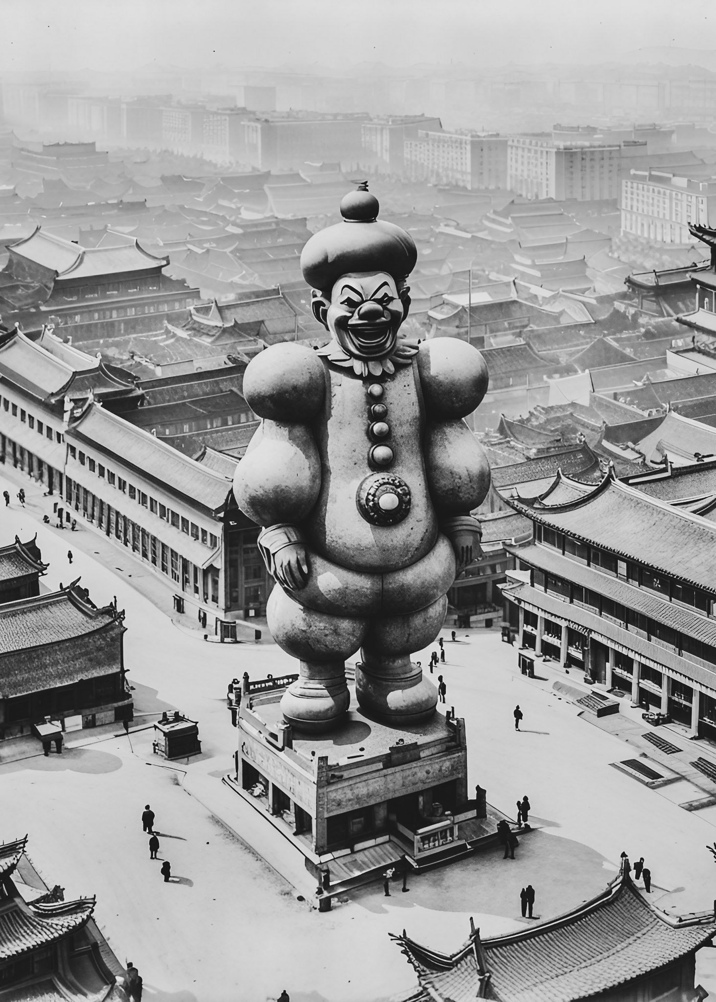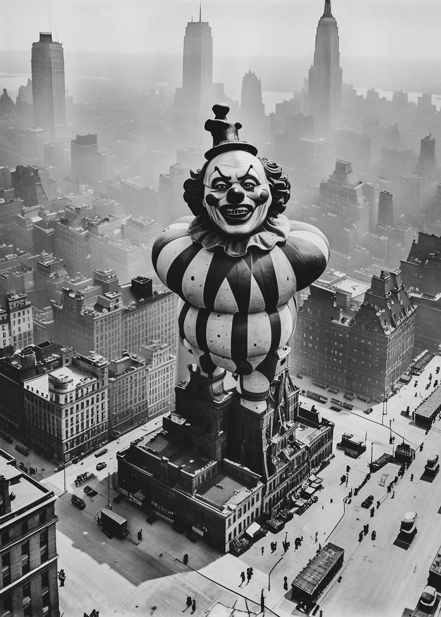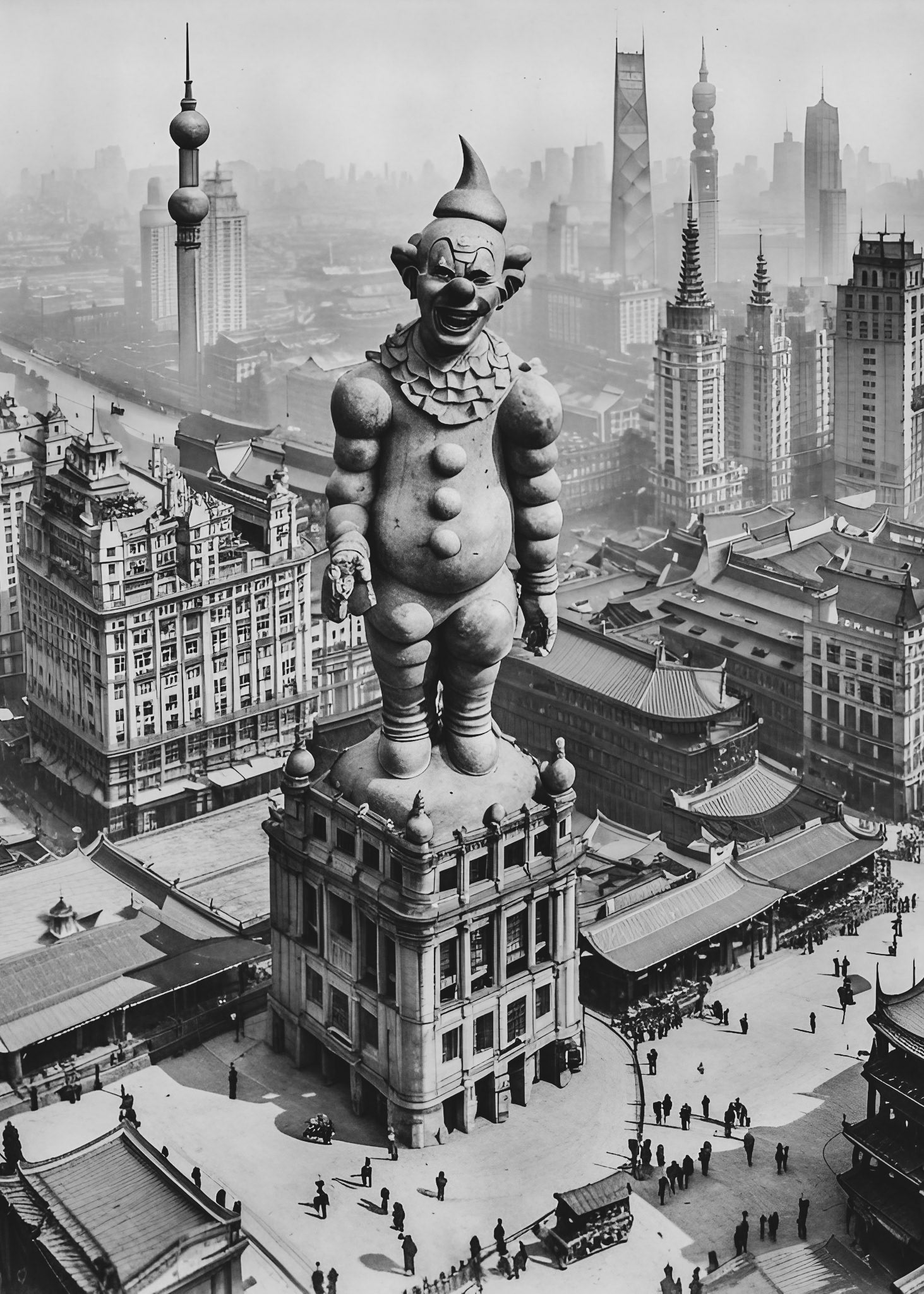 Series of surreal photographs featuring giant clown statues towering over vintage cityscapes from the 1920s.