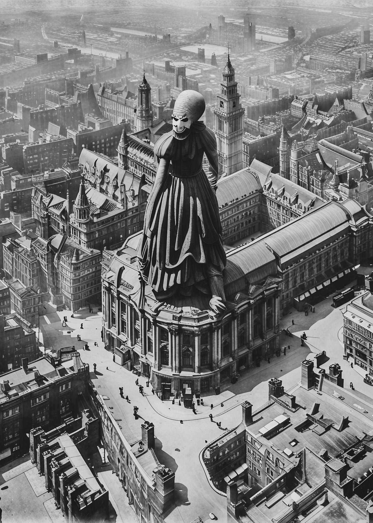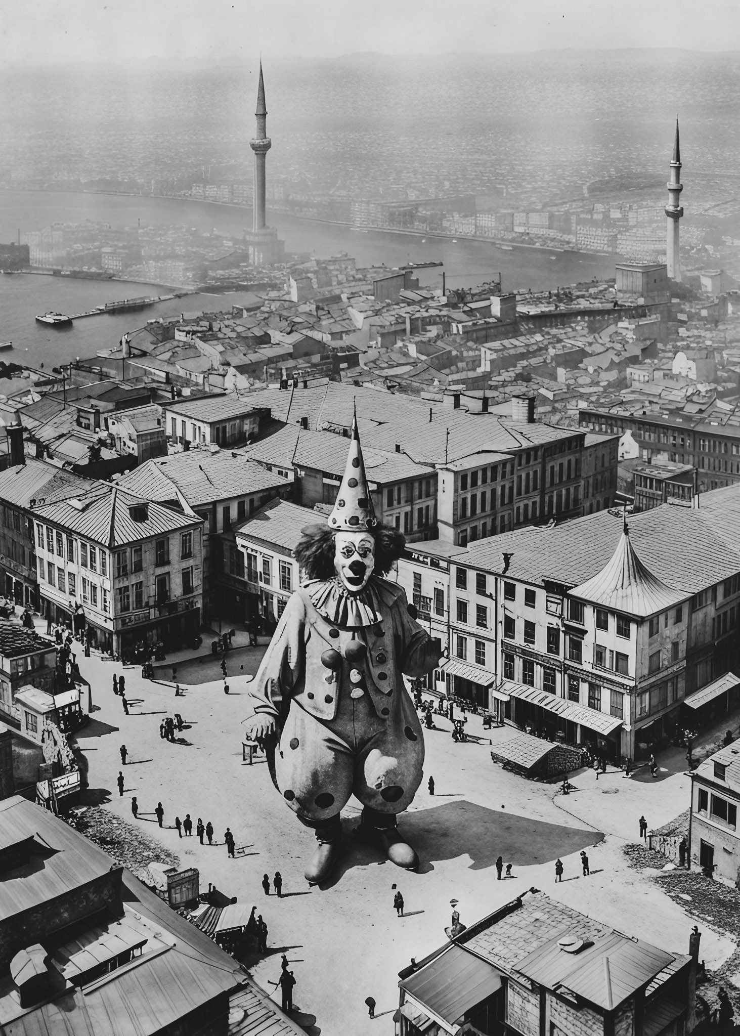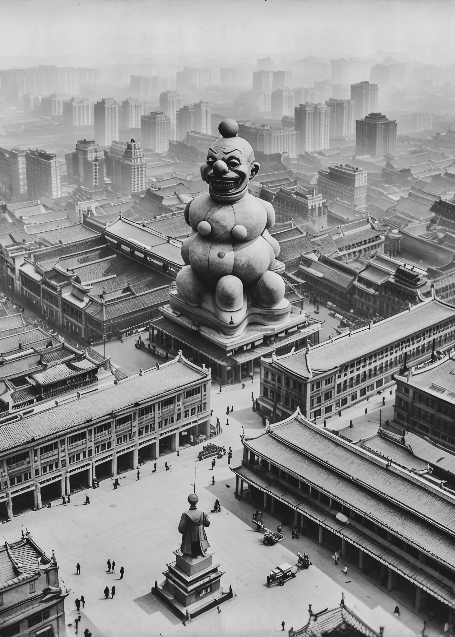 Series of surreal photographs featuring giant clown statues towering over vintage cityscapes from the 1920s.