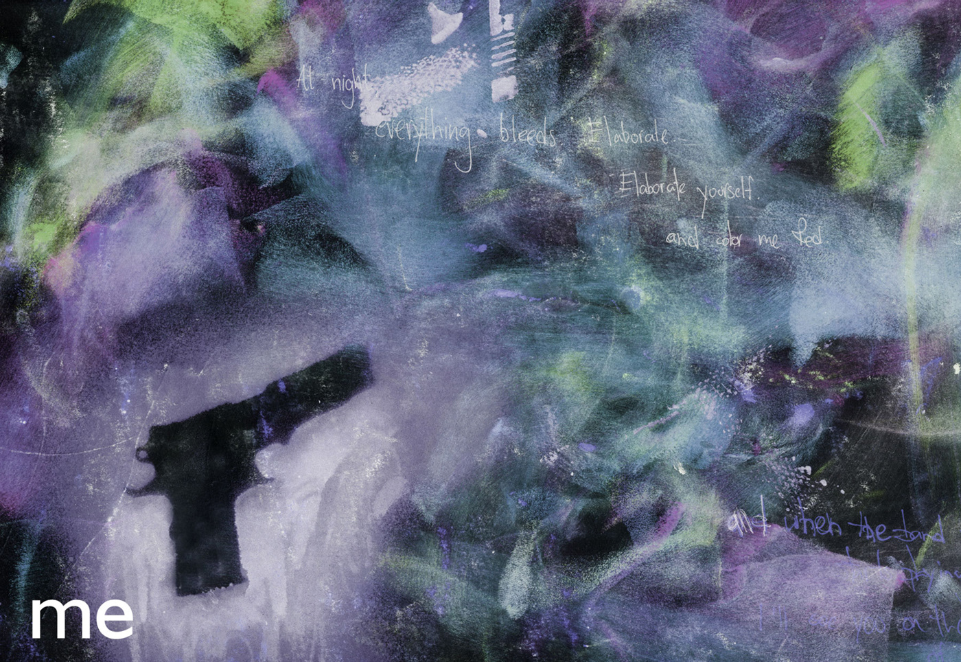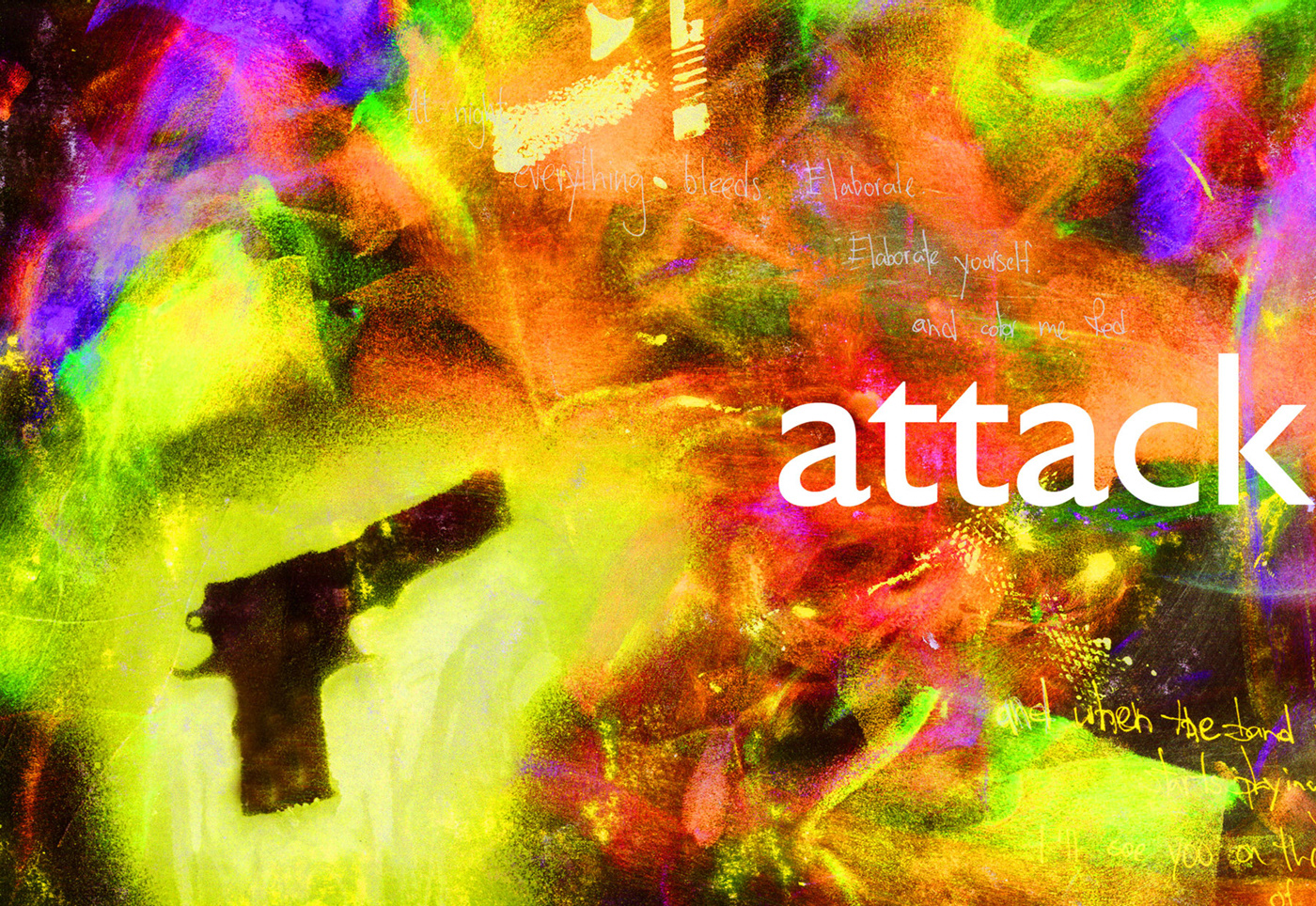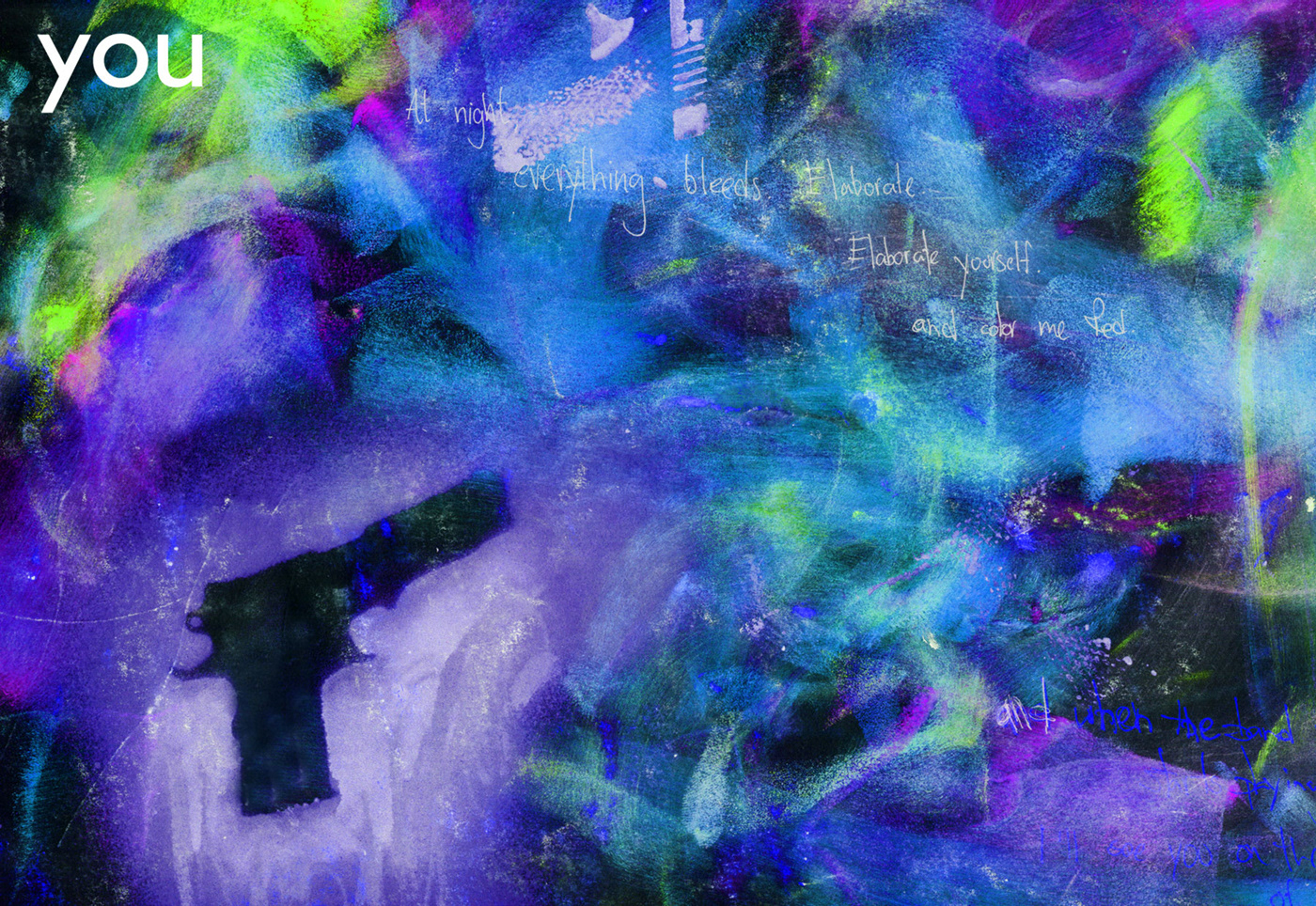 Coffee-table book, with mixed media. The project investigated the role of intuition in graphic design. Spraypaint, acrylic, watercolour, charcoal, collage + colour pencils + digital.